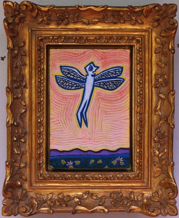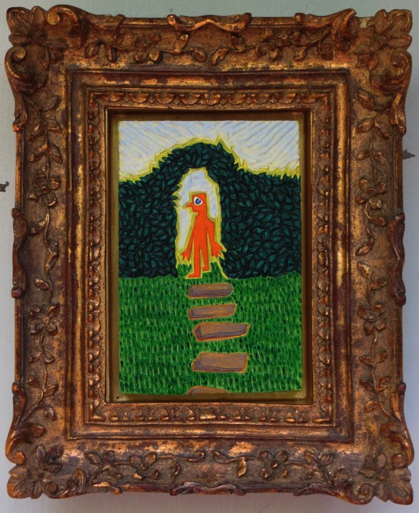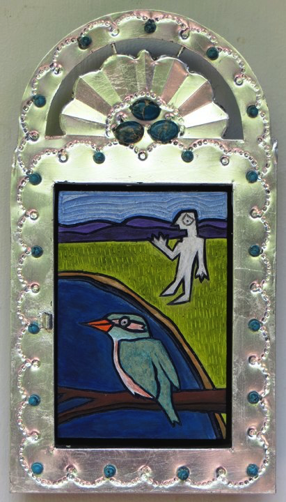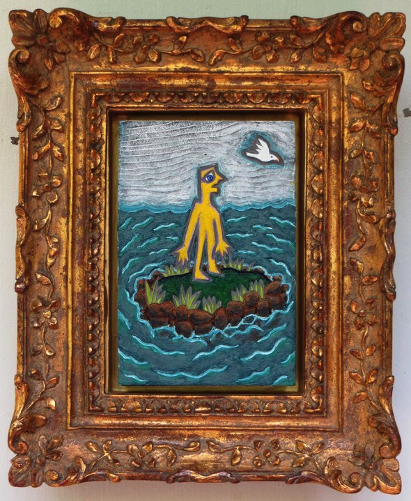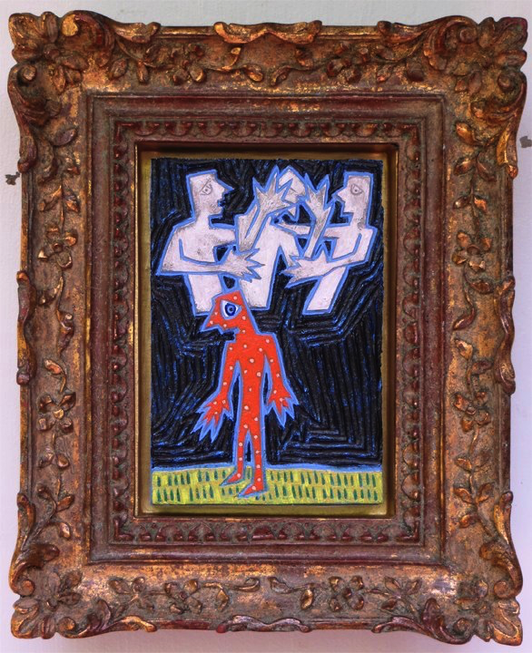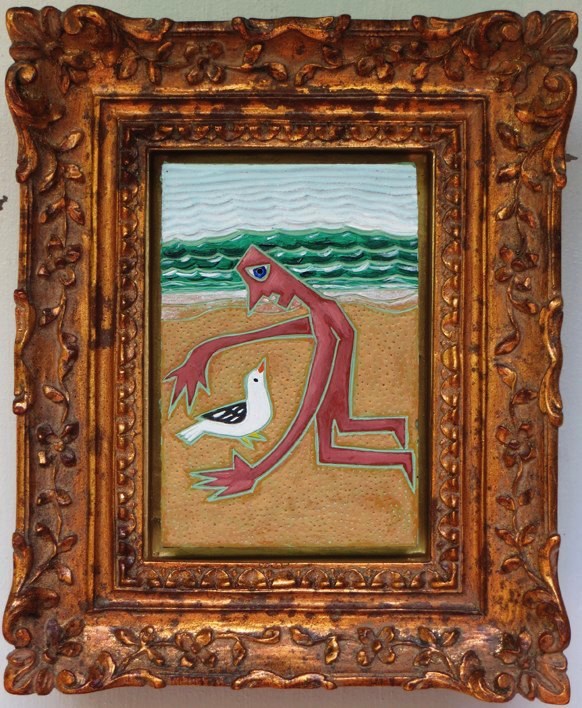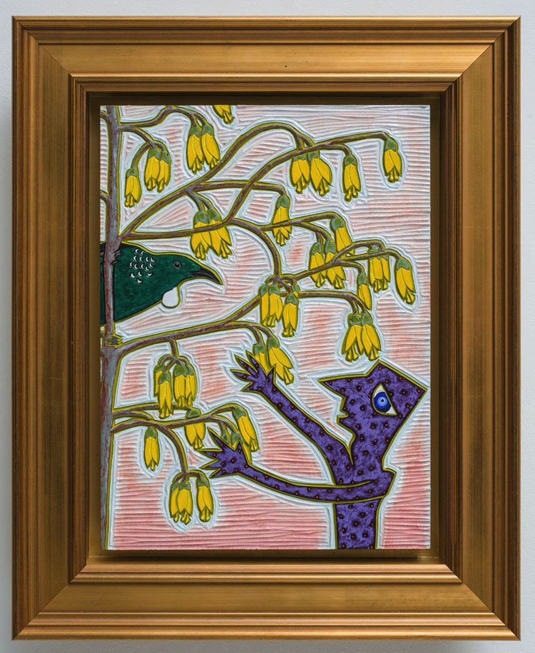 Bas relief (shallow or low relief) is a technique where an image is carved into a substrate like plaster or wood. These pieces are carved into linoleum mounted on wood. If you were to roll printmaking ink onto the upper surface of the carving, you could then transfer the ink onto paper, creating a linocut. I have chosen to paint them instead.