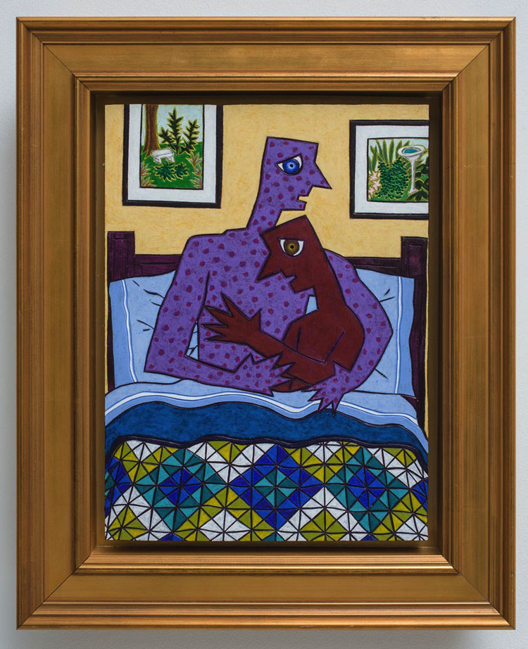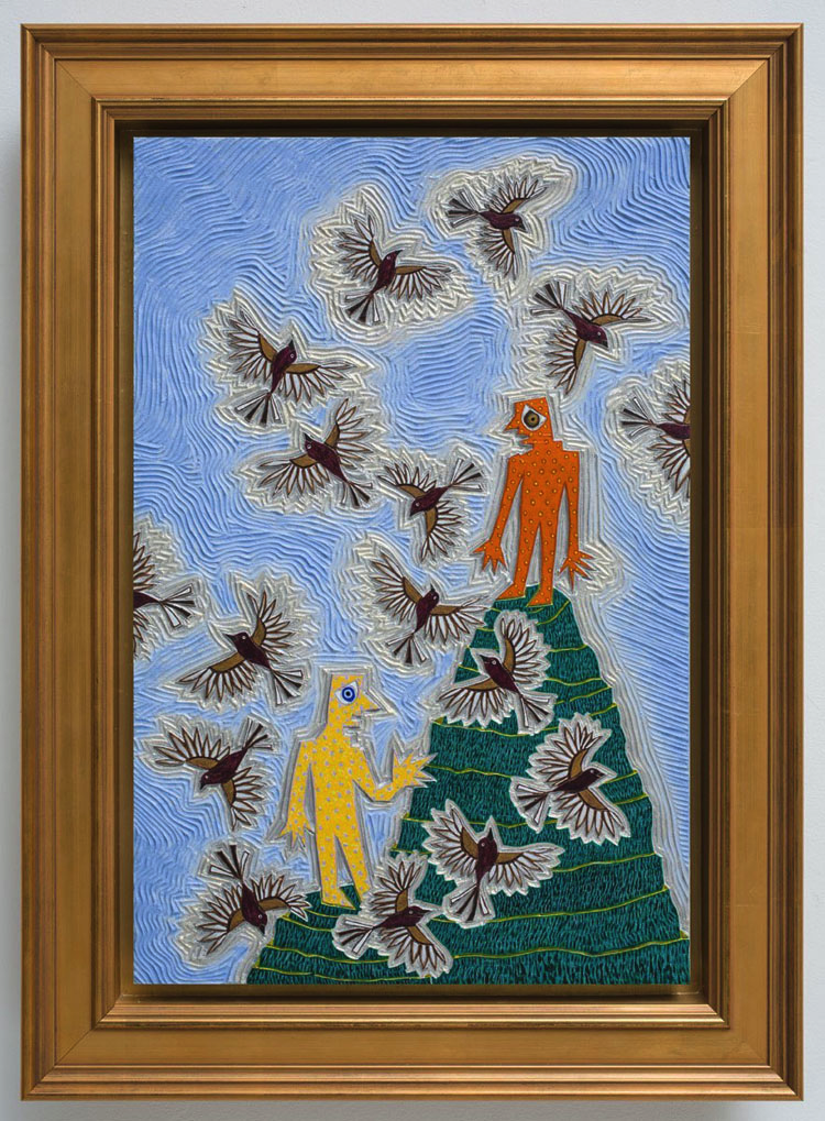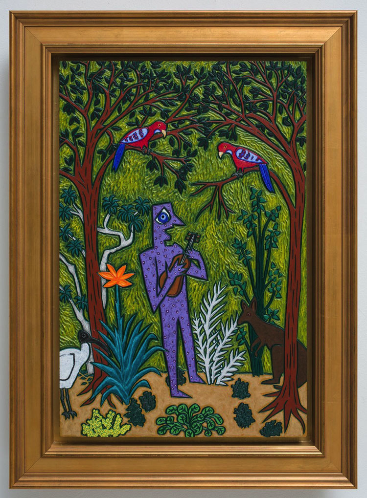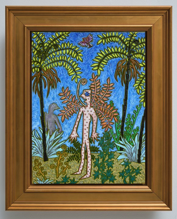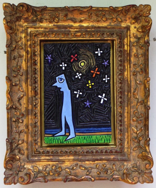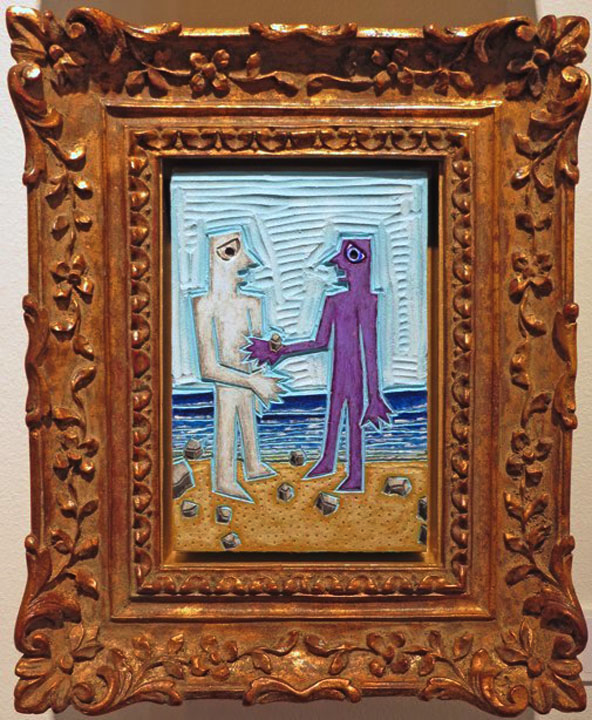 Bas relief (shallow or low relief) is a technique where an image is carved into a substrate like plaster or wood. These pieces are carved into linoleum mounted on wood. If you were to roll printmaking ink onto the upper surface of the carving, you could then transfer the ink onto paper, creating a linocut. I have chosen to paint them instead.
