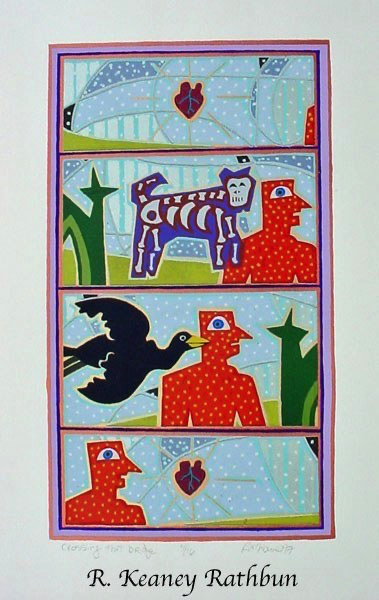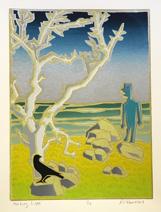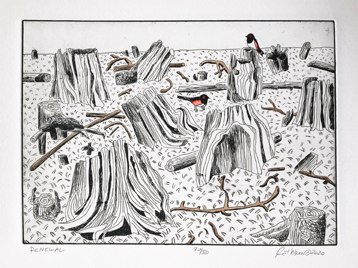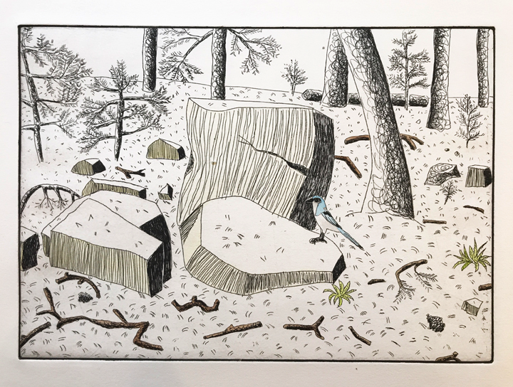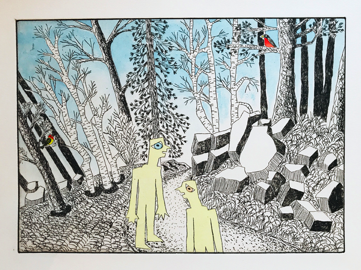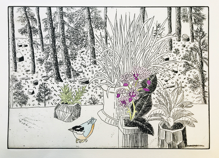 To create an etching you first coat a piece of copper plate with a tar-like substance called asphaltum, which protects the copper from the acid bath. You draw through the asphaltum with a needle which exposes the copper to the acid bath which follows. The longer the plate is in the acid the deeper the lines are etched into the copper and the more ink that it will take to fill the etched lines, resulting in a darker line. After the acid bath, you remove the asphaltum and rub ink into the lines and remove any excess ink that remains on the surface of the plate. A piece of paper is laid on the plate, and both are put through a press. The ink is transferred to the paper and you get a mirror image of the original drawing.