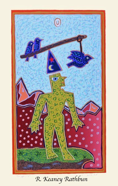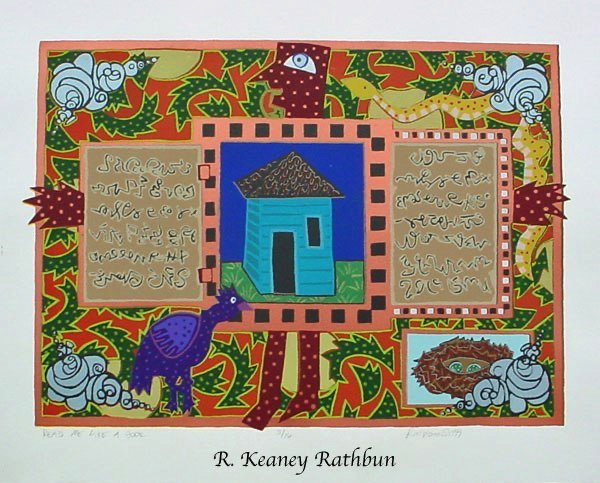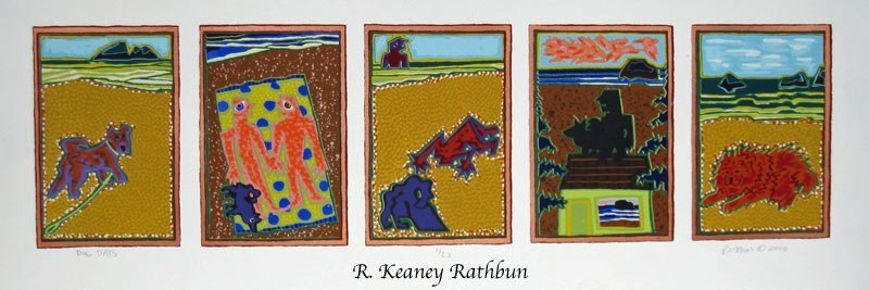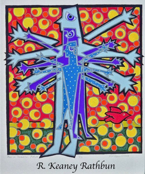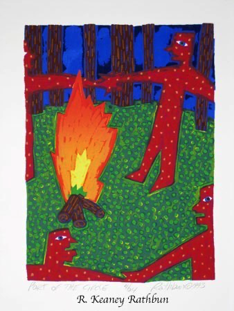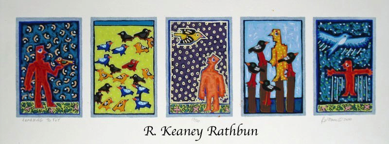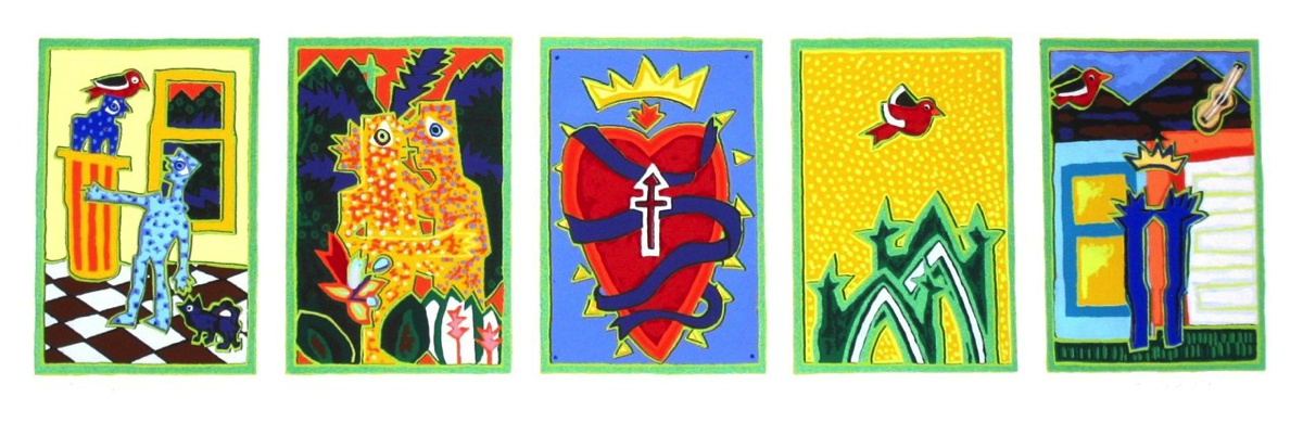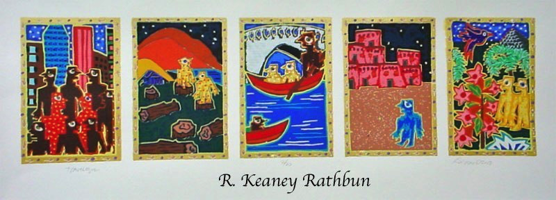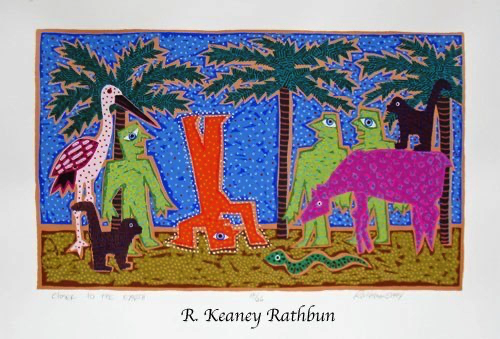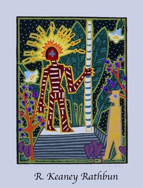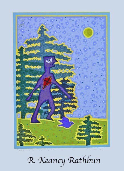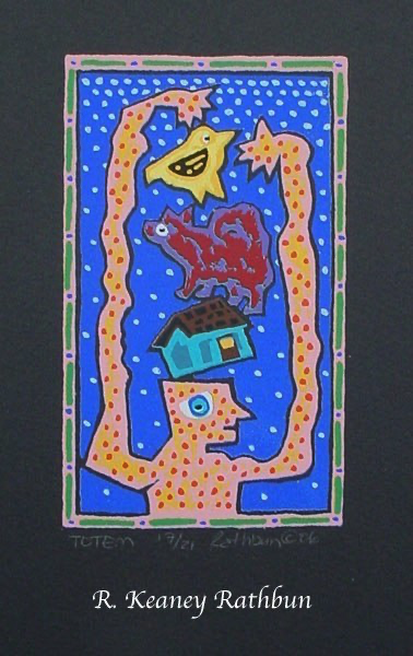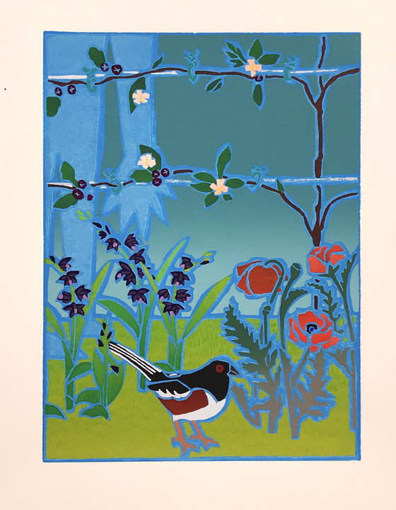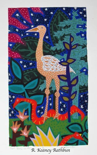 Screenprinting is a printmaking technique where a stencil is made on a piece of thin mesh fabric (originally silk) stretched over a wooden frame. Thick ink is passed through the opening of the stencil onto each piece of paper in the edition. A second stencil is then created and the second layer of ink is printed on top of the first one. This process is repeated until the print is completed. My larger prints often require fifty to sixty layers to create these exuberant images.